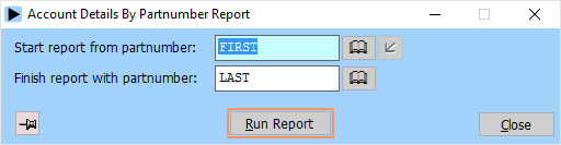 The partnumber account detail report gives the accounts codes for a given range of partnumbers. This is useful for cross-checking with your accounts system: