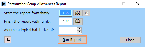 The scrap allowance details report lists the scrap allowance figures for a given range of families. It will also calculate the theoretical scrap allowance for a given typical batch