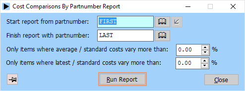 The cost comparison reports analyse the standard, average and latest costs of a range of partnumbers or families. The system compares the average and latest costs of each item with its standard cost, and calculates the variance. Optionally items can be printed only if the variance of their current costs exceeds a certain limit. These reports can be used to identify those stock items where the current costs differ from the standard cost by such an amount that it may be prudent to revise the standard cost: