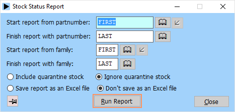 The stock status report lists the detailed stock figures for a range of partnumbers and families. This report allows you to examine your current stock situation in detail: