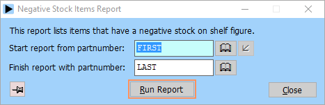 A negative stock items report lists items where the stock on shelf figure is less than zero. As this can only happen if an error has been made it is important that the reason for each occurrence is investigated: