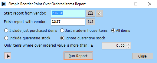 The over ordered items report lists those items that have the order method simple stock control - reorder point control and are on order, even though the stock of the item is not below their reorder level. This report allows you to see any items you're buying that you might not actually need:
