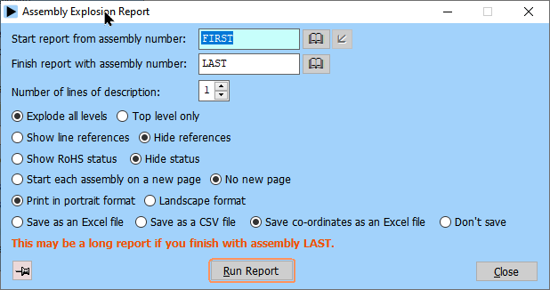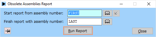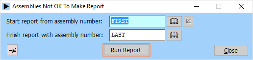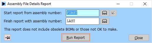 Many of the Assemblies module reports print details for a range of assemblies. This allows you to limit the amount of information listed. You should be careful when selecting the ranges for reports, as assembly explosions can be lengthy. Note that to start from the beginning of a range the word FIRST should be entered as the ‘from’ value. To go to the end of a range enter the word LAST as the ‘to’ value.