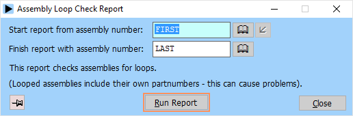 If an assembly occurs somewhere in its own assembly (due to a mistake during entry) then when Herschel tries to explode through the layers of the assembly it will keep exploding to a lower level each time. A structure like this is known as a “looped” assembly. The assembly loop check report checks all the assemblies on file for looped structures. Note that a looped structure will not cause your computer to crash or hang - Herschel will stop exploding once it reaches fifteen levels of sub-assemblies. However, as a looped structure could be exploded into a large number of component items it is wise to run this report periodically, especially if you are using the Plan module: