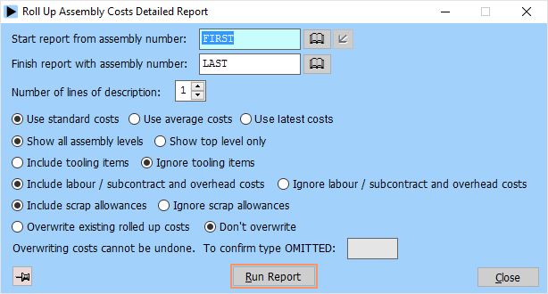 The roll up costs reports can list a complete breakdown of how rolled up costs are calculated (detailed), or a summary of costs only (summary), for a range of assemblies. These reports are ideal for checking and reference purposes. The newly calculated costs can overwrite the existing costs if required. Scrap can be included if required and tooling items may be excluded from the roll ups: