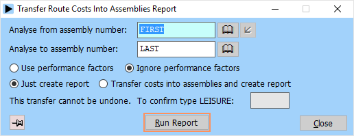 The transfer route costs into assemblies report works in the same way as the transfer route costs option - except it will calculate the route costs for a given range of assemblies at once: