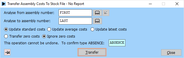 Once the rolled-up costs have been checked they can be transferred to the stock file in the Store module by running the transfer assembly costs to stock file report. The standard, average or latest cost can be updated: