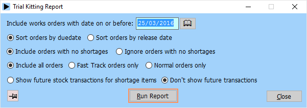 A trial kitting report analyses all orders up to a given date and calculates which items are missing from each kit. This can be used by your production or purchasing department as a work-to list.
