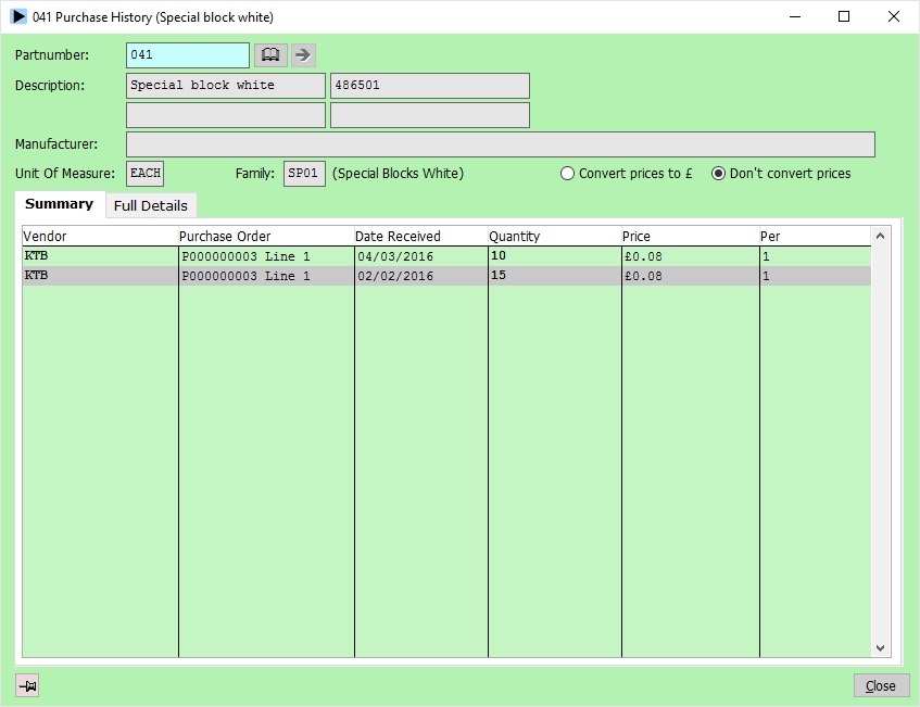 The partnumber purchases enquiry displays the purchases of a given partnumber. On the summary page, purchases are listed in descending receipt date order - in other words the most recent purchases are shown first. Full price details are shown: