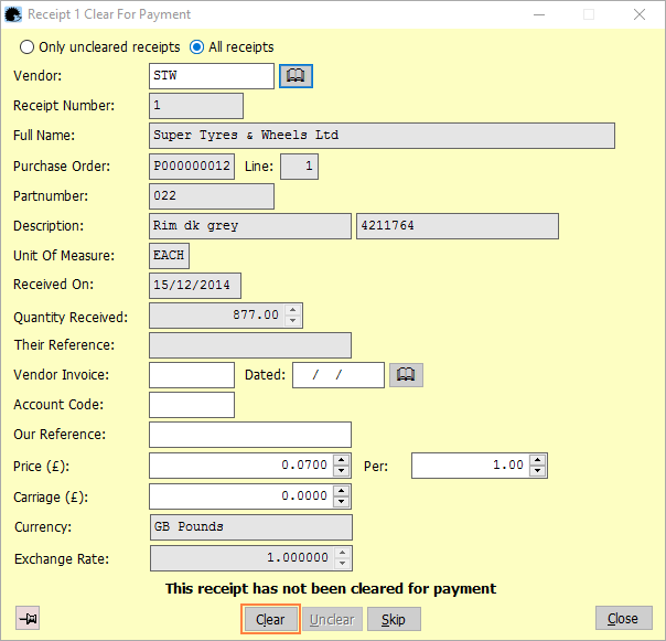 The clear for payment options allows you to record which receipts have been approved for payment. You can do this in vendor or receipt number sequence: