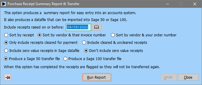 The receipts summary & transfer option lists all receipts raised. It can include just cleared or all receipts. This report is designed to allow easy manual entry of receipt data into your accounts package. Note that a receipt will only appear on this report once. This reduces the possibility of entering the receipt details into your accounts twice. A transfer file of data is produced that can be imported into your accounts package: