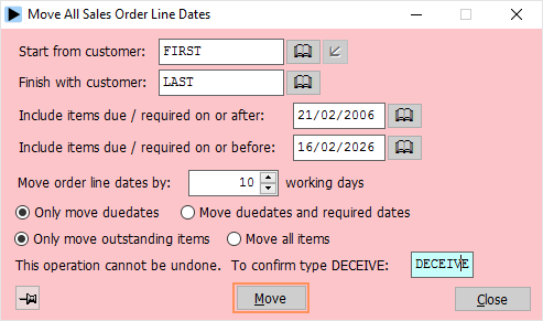 The move all order lines option allows you to move the or duedates of the sales orders for a range of customers. The dates can be moved forwards or backwards: