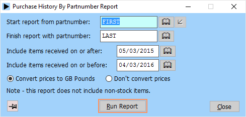 A purchases by partnumber report prints purchases for given ranges of partnumbers and receipt dates. As full pricing details and totals are given and late receipts highlighted, this report can be a useful reference or analysis document: